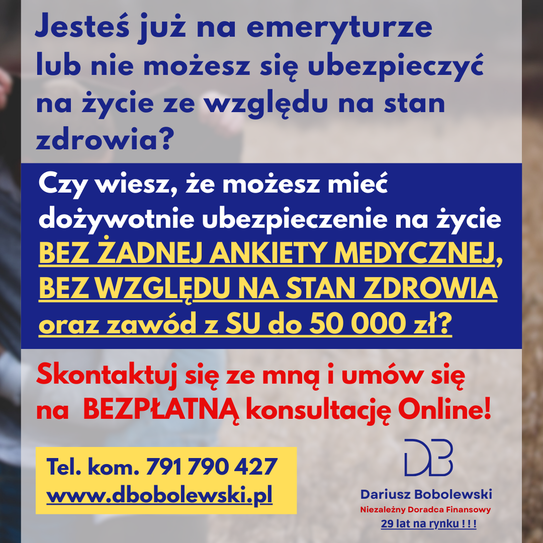 Niezależny Ekspert Ubezpieczeniowo - Finansowy - 29 lat na rynku ! ! !. BEZPŁATNE DORADZTWO ONLINE - WERYFIKACJA I OPTYMALIZACJA UMÓW KLIENTA. Oferta ponad 50 TU i 30 Banków. ZAPRASZAM DO KONTAKTU. OFERTA SPEC...